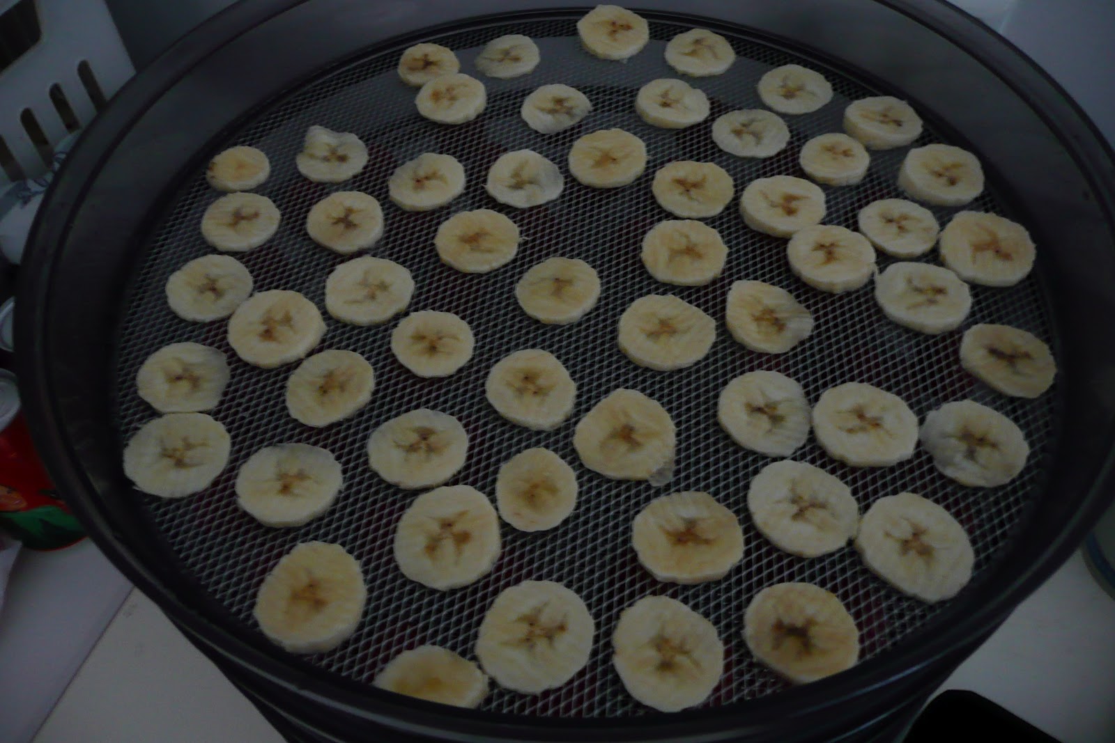 De gedroogde frambozen waren zó lekker dat ik zaterdag op de markt 6 doosjes heb gekocht en op 3 roosters gelegd. Ook nog een rooster met banaan belegd. Nu gesneden met een stainless steel mes. Water met citroen erover gespoten, maar toch wel een beetje bruin geworden. Dat doet overigens niets aan de smaak af. 7 uur op 70º was genoeg voor de banaan, maar de frambozen deden er nog 3 uur extra over.
